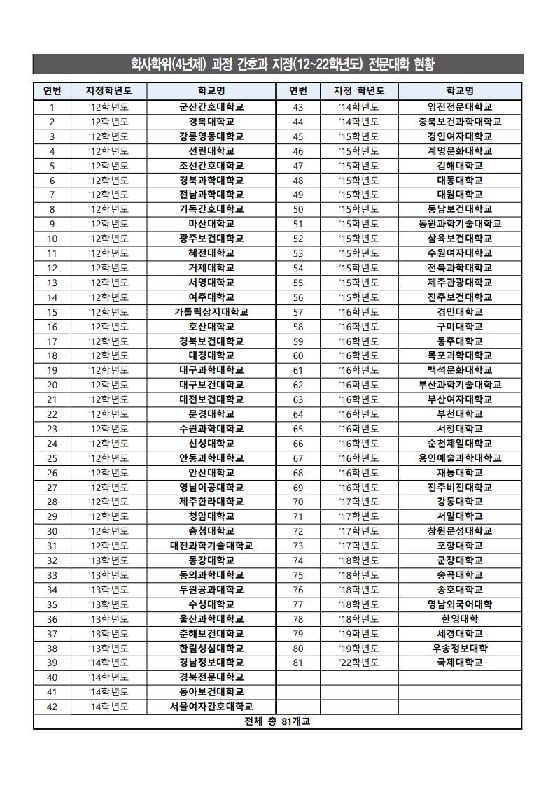 2026학년도 편입학 모집 학사학위과정 간호과 지정 전문대학 현황